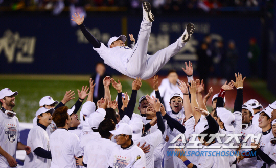 김태형 감독의 헹가래를 필두로 박용만 회장, 박정원 구단주, 김승영 사장의 몸에 공중을 향했다. 선수들은 여기에 맞춰 몇 차례나 뛰었다 내려갔다. 얼굴에는 미소가 가득했다.