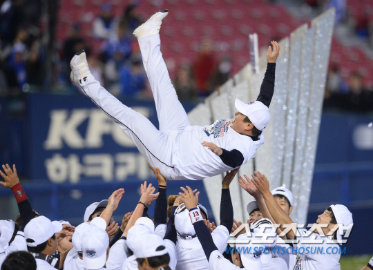 두산이 31일 서울 잠실야구장에서 열린 한국시리즈 5차전에서 삼성을 누르고 우승을 차지했다.시리즈 전적 4승1패로 14년만에 우승을 거머쥔 두산 선수들이 우승의 기쁨을 만끽하고 있다. 두산의 김태형 감독이 선수들로부터 헹가래를 받고 있다. 잠실=최문영 기자deer@sportschosun.com