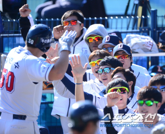두산 김현수가 31일 잠실에서 열린 삼성과의 한국시리즈 5차전서 1회말 2사 1,2루서 양의지의 적시타 때 득점을 올린 뒤 동료들과 하이파이브를 하고 있다. 잠실=김경민 기자 kyungmin@sportschosun.com