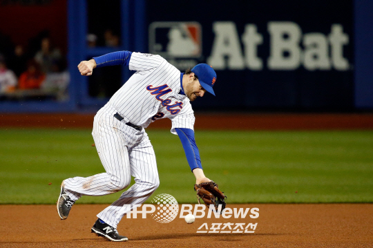 | 뉴욕 메츠 2루수 다니엘 머피가 1일(한국시각) 열린 캔자스시티 로열스와의 월드시리즈 4차전서 3-2로 앞선 8회초 1사 1,2루서 에릭 호스머의 평범한 땅볼을 글러브 밑으로 빠트리는 실책을 범하고 있다. 이 실책이 빌미가 돼 메츠는 3대5로 역전패를 당하고 말았다. ⓒAFPBBNews = News1 |