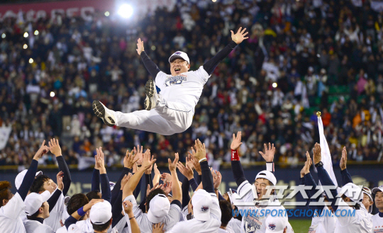 두산이 14년 만에 한국시리즈 우승을 차지했다. 두산 베어스는 10월 31일 잠실구장에서 열린 한국시리즈 5차전 삼성과 경기에서 13대 2 대승을 거두며 시리즈 전적 4승 1패로 우승을 차지했다. 두산 선수들이 김태형 감독을 헹가래 치고 있다. 잠실=송정헌 기자 songs@sportschosun.com/2015.10.31 |