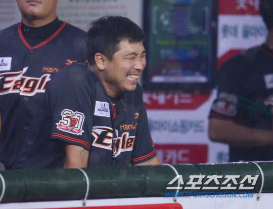 12일 오후 부산 사직야구장에서 2015 프로야구 한화와 롯데의 경기가 열렸다. 0대8로 뒤지던 3회말 내린 폭우로 경기가 중단된 후 한화 허도환이 환하게 웃고 있다. 부산=김경민 기자 kyungmin@sportschosun.com / 2015.09.12.