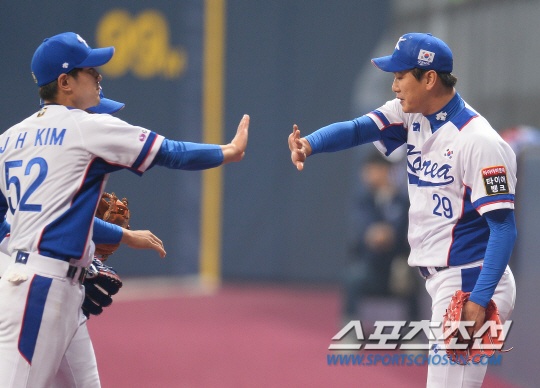 프리미어12 야구대표팀이 4일 고척스카이돔에서 쿠바와의 '2015 서울 슈퍼시리즈' 1차전 경기를 펼쳤다. 야구대표팀은 오는 8일 개막하는 프리미어12에 앞서 쿠바를 초청해 4일과 5일 개장 경기 겸 평가전을 갖고 컨디션을 점검한다. 김광현이 3회 투구를 마치고 동료들과 하이파이브를 나누고 있다. 송정헌 기자 songs@sportschosun.com/2015.11.04