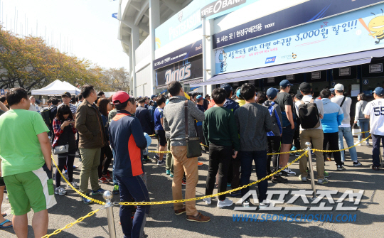 2015 프로야구 플레이오프 1차전 NC다이노스와 두산베어스의 경기가 18일 마산야구장에서 열렸다. 마산야구장 11000석의 좌석이 모두 매진된 가운데 팬들이 예약표를 찾기위해 장사진을 이루고 있다. 마산=최문영 기자deer@sportschosun.com