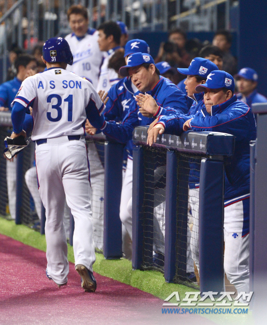 프리미어12 야구대표팀이 4일 고척스카이돔에서 쿠바와의 '2015 서울 슈퍼시리즈' 1차전 경기를 펼쳤다. 야구대표팀은 오는 8일 개막하는 프리미어12에 앞서 쿠바를 초청해 4일과 5일 개장 경기 겸 평가전을 갖고 컨디션을 점검한다. 김현수가 1회 쿠바 에라를 상대로 고척돔 첫 안타를 기록하고 있다. 강민호의 밀어내기 볼넷으로 득점에 성공한 손아섭이 덕아웃에서 하이파이브를 나누고 있다. 송정헌 기자 songs@sportschosun.com/2015.11.04 |