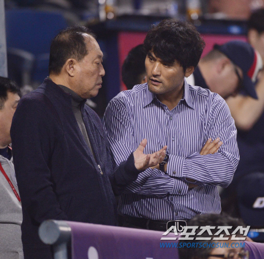21일 오후 서울 잠실야구장에서 2015 프로야구 NC와 두산의 경기가 열렸다. 김인식 감독과 박찬호가 이야기를 나누고 있다. 잠실=김경민 기자 kyungmin@sportschosun.com / 2015.10.21.