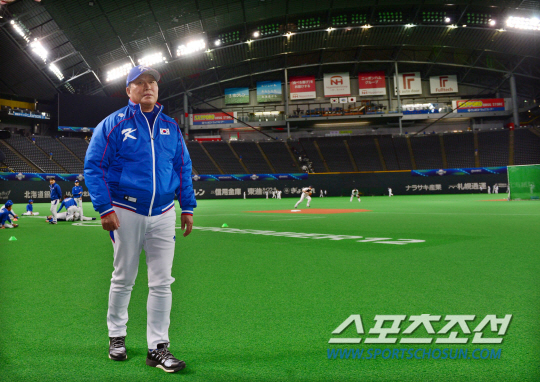 8일 오후 일본 삿포로돔에서 열릴 프리미어 12 개막전 한국과 일본의 경기에 앞서 김인식 감독이 그라운드를 살피고 있다.