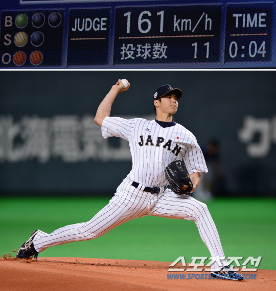 오타니는 8일 저녁 일본 삿포로돔에서 열린 한국과의 개막전에 선발로 나와 한국 1번 이용규와 2번 정근우를 각각 2루수 땅볼과 유격수 뜬공으로 처리했다. 그의 전매특허인 강속구는 이때까지는 나오지 않았다. 154㎞까지만 나왔다. 매우 빠른 공이지만, 개인 최고 162㎞의 강속구를 던졌던 오타니의 명성에는 부족한 스피드.