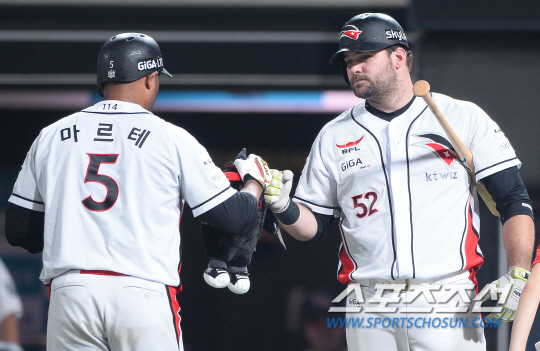 10일 수원 케이티위즈파크에서 KBO리그 kt 위즈와 LG 트윈스의 경기가 열렸다. kt 정성곤과 LG 우규민이 선발 맞대결을 펼쳤다. kt 마르테가 6회 LG 선발 우규민에게 동점 솔로홈런을 날렸다. 득점하며 댄블랙과 하이파이브를 나누고 있는 마르테. 수원=송정헌 기자 songs@sportschosun.com/2015.09.10