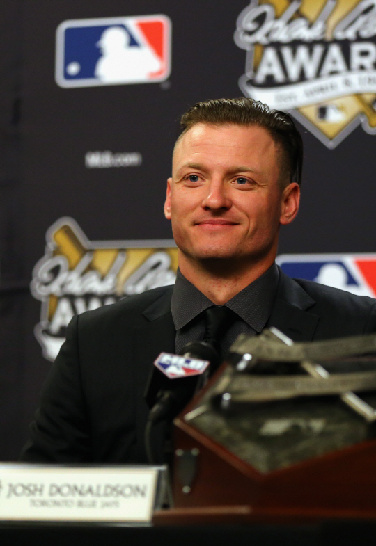 메이저리그 토론토 블루제이스의 홈런타자 조시 도널드슨이 10일(한국시각) 메이저리그 선수들이 뽑는 '플레이어스 초이스 어워드'에서 올해의 선수상을 받았다. 도널드슨은 올해 158경기에 나와 2할9푼7리 41홈런 123타점으로 아메리칸리그 타점 1위, 홈런 공동 3위에 올랐다. 사진은 지난 1일 행크 아론 어워드상 수상자로 뽑힌 도널드슨.ⓒAFPBBNews = News1