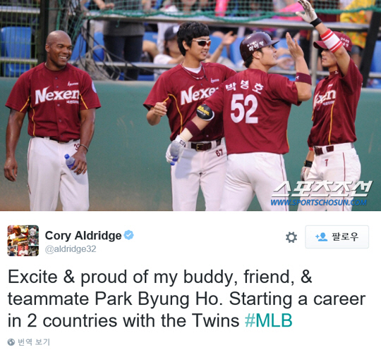 알드리지는 10일(한국시각) 자신의 SNS에 "흥분되고 자랑스럽다. 내 친구이자 팀동료였던 박병호. 그의 커리어 시작은 두 나라에서 모두 트윈스"라고 썼다.