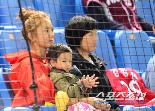 야구선수 이용규(31, 한화 이글스) 아내 유하나가 아들과 함께 야구장을 찾았다.