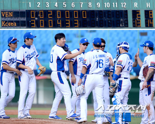 | 한국 야구 대표팀 선수들이 12일 베네수엘라에 13대2 7회 콜드게임승을 거둔 뒤 하이파이브를 나누고 있다. 타이베이(대만)=송정헌 기자 songs@sportschosun.com/2015.11.12 |