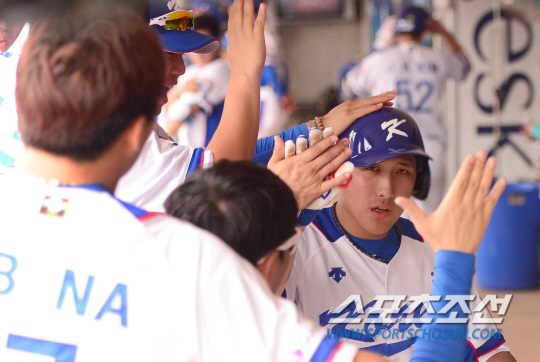 프리미어12에 참가하는 야구대표팀이 12일 오후 대만 타이베이 타오위안구장에서 베네수엘라와 조별리그 3차전 경기를 펼쳤다. 1승 1패를 기록 중인 대표팀은 이대은이 선발로 나섰다. 황재균이 5회 연타석 홈런포를 날렸다. 덕아웃에서 동료들과 하이파이브를 나누고 있는 황재균. 타이베이(대만)=송정헌 기자 songs@sportschosun.com/2015.11.12