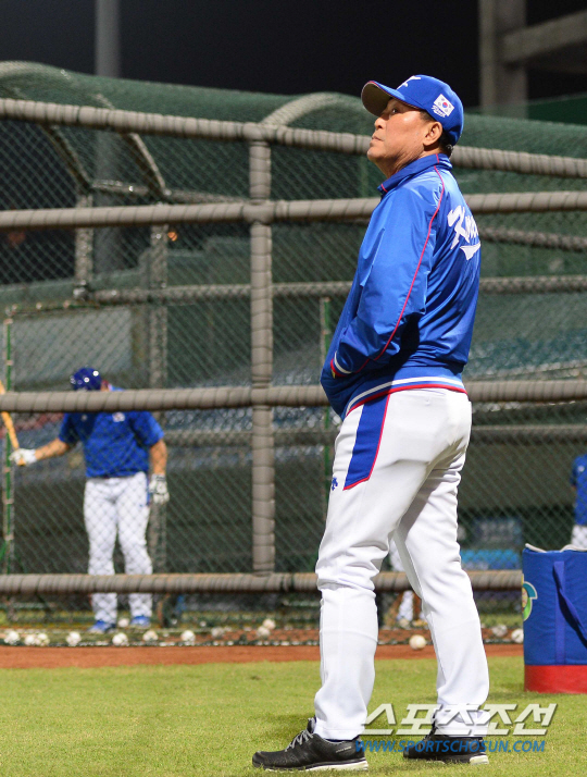 프리미어12에 참가하는 야구대표팀이 10일 오후 타이베이 티엔무구장에서 공식훈련을 펼쳤다. 야구대표팀은 11일부터 도미니카공화국과 조별리그 2차전 경기를 펼친다. 선수들이 훈련에 임하고 있다. 김인식 감독이 선수들의 타격을 지켜보고 있다. 타이베이(대만)=송정헌 기자 songs@sportschosun.com/2015.11.10 |