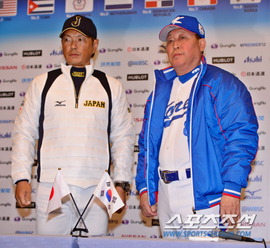 7일 오후 일본 삿포로에 위치한 로이톤 호텔에서 프리미어 12 한국과 일본의 개막전 기자회견이 열렸다. 기자회견에서 김인식 감독과 일본 고쿠보 감독이 포즈를 취하고 있다. 쿠바와 슈퍼시리즈를 통해 최종 점검을 마친 야구대표팀은 6일부터 일본 훗카이도 삿포로에서 2015 WBSC 프리미어 12 공식 일정을 소화한다. 프리미어 12는 8일 도쿄돔에서 열리는 한국과 일본의 개막전을 시작으로 일본과 대만에서 21일까지 14일 동안 진행된다. 삿포로=김경민 기자 kyungmin@sportschosun.com