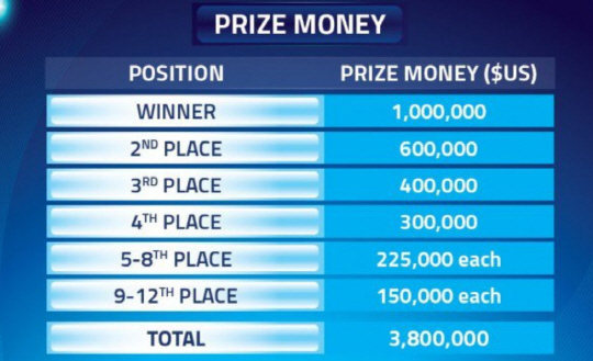 우승팀에는 최고 100만달러(약 11억7000만원)가 돌아간다. 준우승팀에는 60만달러(약 7억원), 3위팀에는 40만달러(약 4억7000만원)가 주어진다.