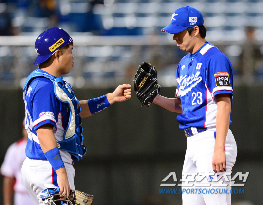 야구대표팀이 14일 오후 대만 타이베이시 티엔무구장에서 멕시코와 국가대항전 2015 프리미어 12 대회 조별예선 4차전 경기를 펼쳤다. 2승 1패를 기록 중인 대표팀은 멕시코전을 승리할 경우, 마지막 미국전에 상관없이 8강 진출을 확정하게 된다. 8회 1사에서 마운드를 정대현에게 넘기고 있는 차우찬. 양의지 포수와 하이파이브를 나누고 있다. 타이베이(대만)=송정헌 기자 songs@sportschosun.com