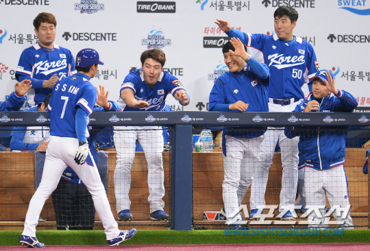 프리미어12 야구대표팀이 5일 고척스카이돔에서 쿠바와의 '2015 서울 슈퍼시리즈' 2차전 경기를 펼쳤다. 야구대표팀은 오는 8일 개막하는 프리미어12에 앞서 쿠바를 초청해 4일과 5일 평가전을 갖고 컨디션을 점검한다. 6회 2사 2루에서 허경민의 1타점 적시타 때 득점에 성공한 김상수가 덕아웃에서 동료들과 하이파이브를 나누고 있다. 송정헌 기자 songs@sportschosun.com