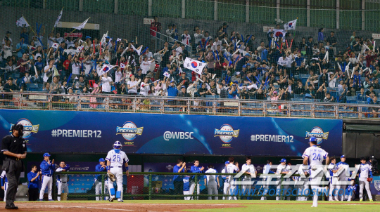 야구대표팀이 15일 오후 대만 타이베이시 티엔무구장에서 미국과 국가대항전 2015 프리미어 12 대회 조별예선 마지막 경기를 펼쳤다. 경기장을 찾은 한국 응원단이 태극기를 흔들며 뜨거운 응원을 펼치고 있다. 타이베이(대만)=송정헌 기자 songs@sportschosun.com/2015.11.15