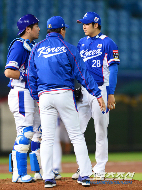프리미어12에 참가하는 야구대표팀이 11일 오후 대만 타이베이 타오위안구장에서 도미니카공화국과 조별리그 2차전 경기를 펼쳤다. 개막전에서 일본에 1패를 당한 대표팀은 장원준을 선발로 내세워 첫 승에 도전한다. 5회 장원준이 선취점을 허용하자 선동열 코치가 마운드에 올라 대화를 나누고 있다. 타이베이(대만)=송정헌 기자 songs@sportschosun.com/2015.11.11