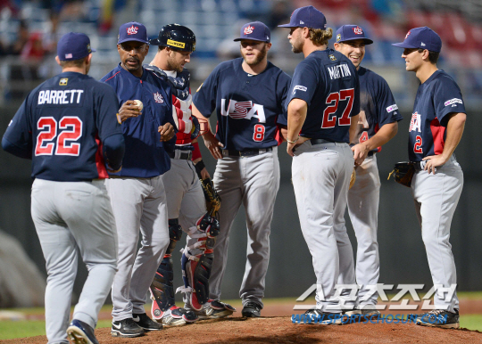 야구대표팀이 15일 오후 대만 타이베이시 티엔무구장에서 미국과 국가대항전 2015 프리미어 12 대회 조별예선 마지막 경기를 펼쳤다. 미국 랜돌프 감독(왼쪽 두 번째)이 8회 직접 마운드에 올라 투수를 교체하고 있다. 타이베이(대만)=송정헌 기자 songs@sportschosun.com/2015.11.15
