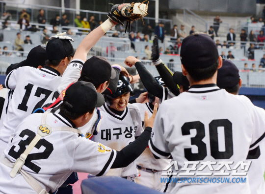 70주년을 맞은 청룡기 전국고교야구선수권대회 상원고와 성남고의 결승전 경기가 16일 오후 서울 고척 스카이돔에서 열렸다. 4회초 무사 2,3루서 상원고 최석호의 적시타 때 선수들이 기뻐하고 있다. 고척돔=김경민 기자 kyugmin@sportschosun.com / 2015.11.16.