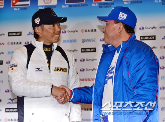 기자회견에서 김인식 감독과 일본 고쿠보 감독이 포즈를 취하고 있다.
