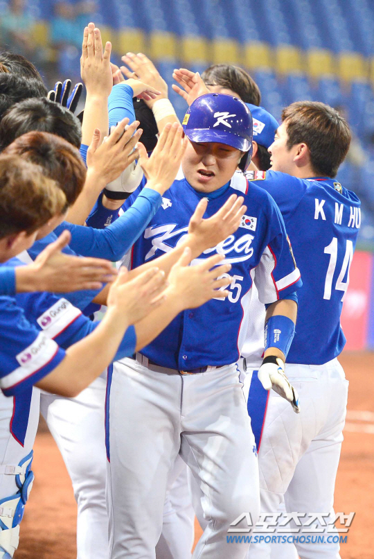 | 한국 야구대표팀 양의자가 16일 쿠바와의 8강전서 2회초 득점에 성공한 뒤 동료들과 하이파이브를 나누고 있다. 타이중(대만)=송정헌 기자 songs@sportschosun.com/2015.11.16 |