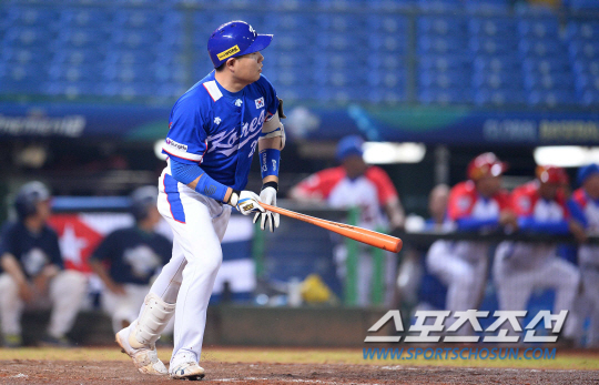 야구대표팀이 16일 오후 대만 타이중 인터콘티넨탈구장에서 쿠바(A조 2위)와 국가대항전 2015 프리미어 12 대회 8강전을 펼쳤다. 8회 양의지가 쿠바 마르티네스를 상대로 도망가는 솔로포를 날렸다. 홈런 타구를 바라보고 있는 양의지. 타이중(대만)=송정헌 기자 songs@sportschosun.com/2015.11.16