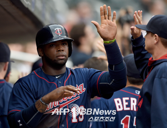 미네소타 트윈스 유망주 거포인 케니스 바르가스가 지난 5월 8일(한국시각) 오클랜드 어슬레틱스전에서 득점 후 동료들과 하이파이브를 하고 있다. ⓒAFPBBNews = News1