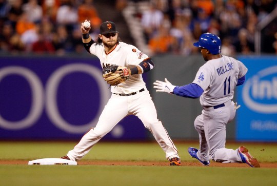| 샌프란시스코가 유격수 브랜든 크로포드와 6년 장기계약을 했다. 지난달 1일(한국시각) LA 다저스와의 경기에서 더블플레이를 하고 있는 크로포드. ⓒAFPBBNews = News1 |