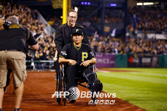 | 코글란의 태클로 부상해 시즌을 접었던 강정호가 내셔널리그 와일드카드 결정전 때 경기전 휠체어를 타고 입장하고 있다. |