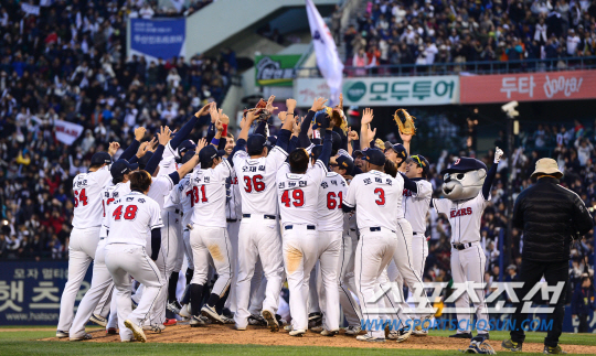 두산이 14년 만에 한국시리즈 우승을 차지했다. 두산 베어스는 10월 31일 잠실구장에서 열린 한국시리즈 5차전 삼성과 경기에서 13대 2 대승을 거두며 시리즈 전적 4승 1패로 우승을 차지했다. 우승이 확정되자 그라운드에 모여 환호하고 있는 두산 선수들. 잠실=송정헌 기자 songs@sportschosun.com