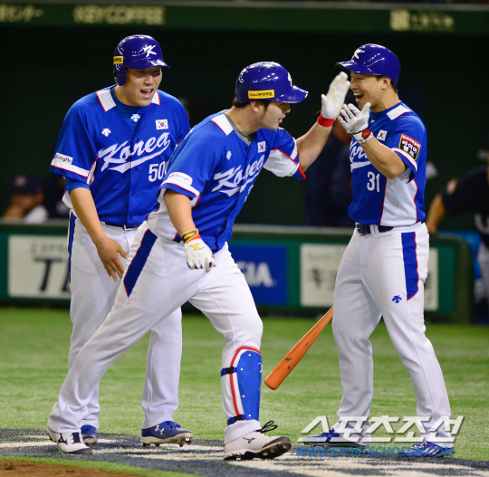 21일 오후 일본 도쿄돔에서 프리미어 12 결승전 미국과 한국의 경기가 열렸다. 4회초 2사 2,3루서 박병호가 좌월 3점 홈런을 친 후 김현수, 손아섭과 환호하고 있다. 도쿄=김경민 기자 kyungmin@sportschosun.com / 2015.11.21.