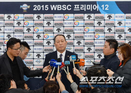 '프리미어 12' 초대 챔피언을 차지한 한국 야구대표팀 22일 오후 김포공항을 통해 귀국하고 있다. 대표팀 김인식 감독이 입국장에서 취재진의 인터뷰에 응하고 있다. 대표팀은 21일 일본 도쿄돔에서 열린 한국과 미국의 '프리미어12' 결승전에서 미국에 8대0 대승을 거두고 우승을 거뒀다. 김포공항=최문영 기자 deer@sportschosun.com /2015.11.22/