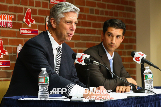 보스턴 레드삭스 데이브 돔브로스키(왼쪽) 사장은 이번 FA 시장에서 에이스급 선발투수를 반드시 데려오겠다고 다짐했다. 돔브로스키 사장이 지난 9월 25일(한국시각) 템파베이 레이스와의 홈경기를 앞두고 기자회견을 하고 있다. ⓒAFPBBNews = News1
