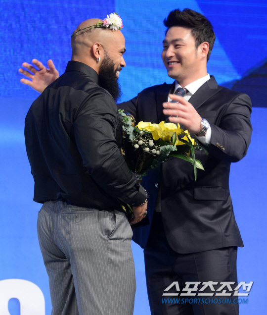 둘은 이에 앞서 진행된 타이틀 시상 순간에서도 훈훈한 장면을 연출했다. 먼저 박병호가 홈런(53개)과 타점(146개) 부문 수상자로 단상에 올랐을 때다. 구본능 KBO 총재가 트로피를 건넨 직후 테임즈가 꽃다발을 들고 올라왔다. 특유의 천진난만한 표정과 함께. 꽃다발을 받은 박병호도 고개를 숙여 고마움을 표시했다. 다음은 테임즈가 타율(0.381), 득점(130점), 출루율(0.497), 장타율(0.790) 부문 트로피 4개를 받은 뒤다. 박병호가 기다렸다는 듯이 단상으로 향했다. 축하한다는 말과 함께 꽃다발을 테임즈의 품에 안겨줬다.