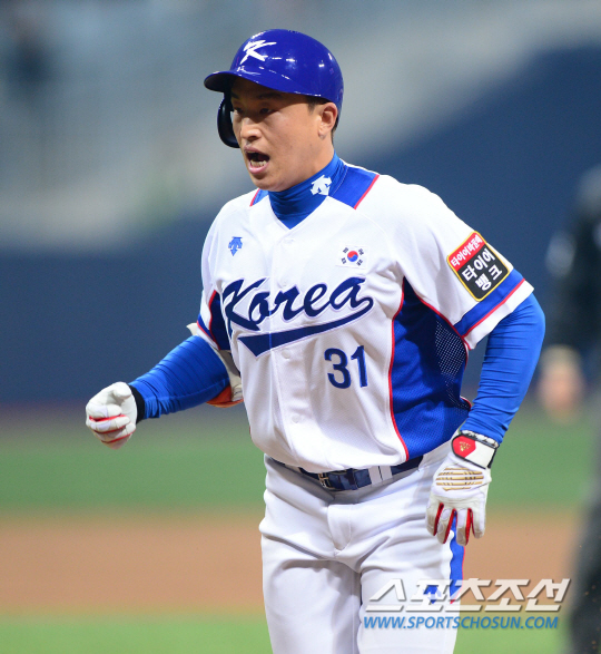4일 서울 고척스카이돔구장에서 한국과 쿠바의 2015 서울 슈퍼시리즈가 열렸다. 1회말 2사 1,2루서 손아섭이 1타점 적시타를 친 후 기뻐하고 있다. 고척돔=김경민 기자 kyungmin@sportschosun.com / 2015.11.04.
