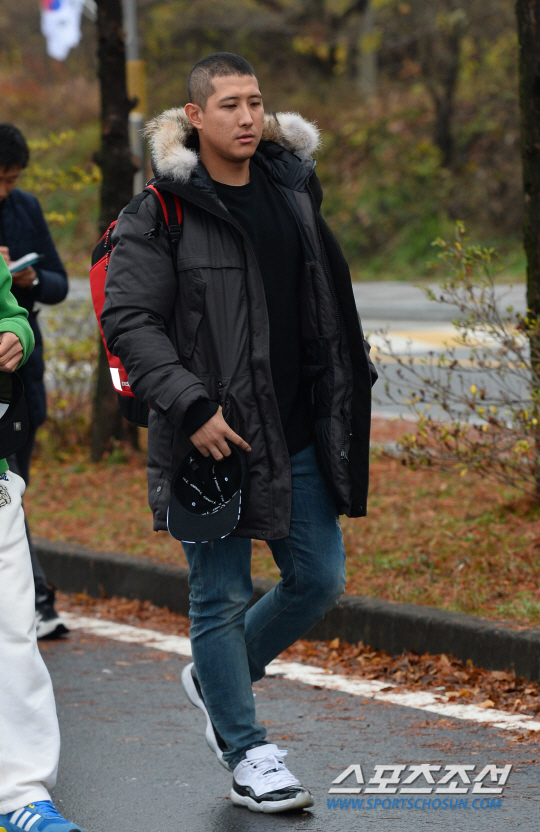 '2015 프리미어12' 에 참가하고 22일 귀국한 삼성 차우찬, 김상수, NC 나성범, 롯데 손아섭, 황재균, 두산 오재원이 23일 충남 세종시에 취치한 32사단 훈련소에 입소했다. 이들은 지난해 인천 아시안게임 금메달 획득으로 군면제 혜택을 받았고 4주간의 기초 군사훈련에 임하게 된다. 세종시=최문영 기자 deer@sportschosun.com
