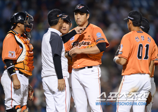 19일 대전 한화생명이글스파크에서 KBO리그 한화 이글스와 두산 베어스의 주말 2연전 첫 번째 경기가 열렸다. 한화가 두산에 7대6으로 승리하며 3연패에서 탈출 했다. 9회 2사에서 마운드에 직접 올라 권혁을 격려하고 있는 김성근 감독 대전=송정헌 기자 songs@sportschosun.com/2015.09.19