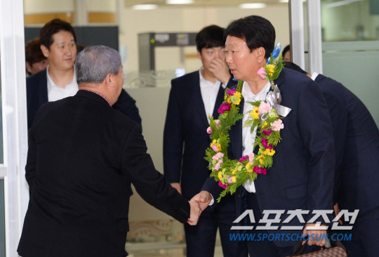 '프리미어 12' 초대 챔피언을 차지한 한국 야구대표팀 22일 오후 김포공항을 통해 귀국하고 있다. 대표팀 선동열 코치가 구본능 KBO 총재로부터 환영의 꽃다발을 받고 있다. 대표팀은 21일 일본 도쿄돔에서 열린 한국과 미국의 '프리미어12' 결승전에서 미국에 8대0 대승을 거두고 우승을 거뒀다. 김포공항=최문영 기자 deer@sportschosun.com /2015.11.22/