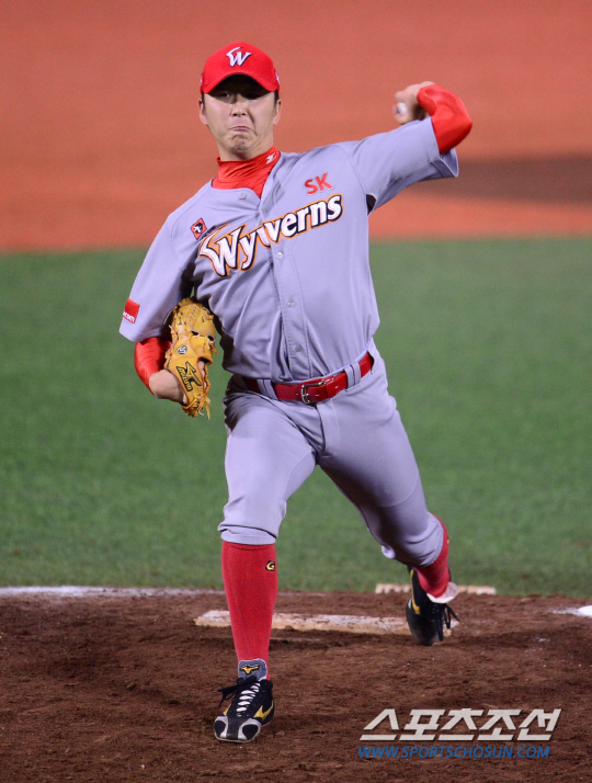 7일 오후 서울 목동야구장에서 2015 프로야구 와일드카드 결정 1차전 SK와 넥센의 경기가 열렸다. SK 정우람이 힘차게 볼을 던지고 있다. 목동=김경민 기자 kyungmin@sportschosun.com / 2015.10.07. |