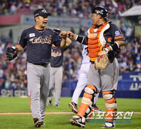2일 오후 서울 잠실야구장에서 2015 프로야구 한화와 LG의 경기가 열렸다. 7회말 2사 2루서 한화 송은범이 LG 임훈을 외야플라이 처리한 후 포수 조인성과 주먹을 맞추고 있다. 잠실=김경민 기자 kyungmin@sportschoun.com / 2015.10.02. |