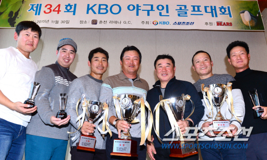 KBO와 스포츠조선이 공동주최하고 두산 베어스가 후원하는 제34회 야구인골프대회가 11월 30일 춘천 라데나 골프클럽에서 열렸다. 야구인골프대회는 프로야구 원년인 1982년부터 매년 야구인들과 함께 했다. 각 구단의 코칭스태프와 선수, 프런트 및 언론인 등 프로야구 관계자들이 모두 모여 친목을 다지는 화합의 장이다. 전홀에서 동시에 티오프하는 샷건 방식으로 진행되며, 공정성을 기하기 위해 숨겨진 홀에 핸디캡을 부과해 순위를 정하는 신페리오 방식을 적용한다. 두산 김진수 코치, 행운상 두산 유희관, 3위 롯데 최만호 코치, 1위 KIA 박흥식 코치, 메달리스트 한화 김광수 코치, 2위 삼성 김평호 코치, 장타상 삼성 장태수 코치(왼쪽부터)가 트로피와 함께 포즈를 취하고 있다. 춘천=송정헌 기자 songs@sportschosun.com/2015.11.30 |