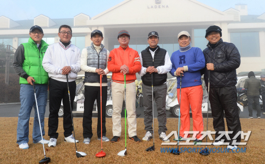 KBO와 스포츠조선이 공동주최하고 두산 베어스가 후원하는 제34회 야구인골프대회가 11월 30일 춘천 라데나 골프클럽에서 열렸다. 야구인골프대회는 프로야구 원년인 1982년부터 매년 야구인들과 함께 했다. 각 구단의 코칭스태프와 선수, 프런트 및 언론인 등 프로야구 관계자들이 모두 모여 친목을 다지는 화합의 장이다. 전홀에서 동시에 티오프하는 샷건 방식으로 진행되며, 공정성을 기하기 위해 숨겨진 홀에 핸디캡을 부과해 순위를 정하는 신페리오 방식을 적용한다. 대회 시작전 참가자인 조원우, 김기태, 염경엽, 류중일, 조범현, 김태형, 양상문 감독이 포즈를 취하고 있다. 춘천=최문영 기자 deer@sportschosun.com /2015.11.30/ |
