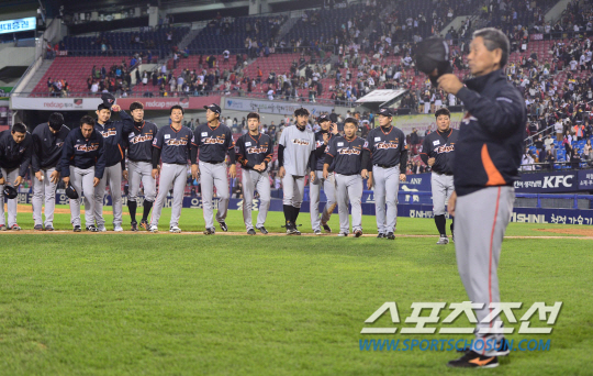 2일 오후 서울 잠실야구장에서 2015 프로야구 한화와 LG의 경기가 열렸다. 6대3으로 승리한 후 한화 선수들이 관중들에게 인사하고 있다. 잠실=김경민 기자 kyungmin@sportschoun.com / 2015.10.02. |