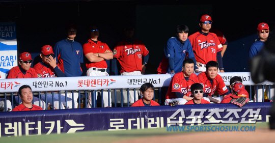 두산베어스와 KIA타이거즈의 경기가 4일 잠실야구장에서 열렸다. 두산에 0대9로 뒤지는 가운데 KIA 선수들이 9회초 마지막 공격을 지켜보고 있다. 잠실=최문영 기자 deer@sportschosun.com /2015.10.04/