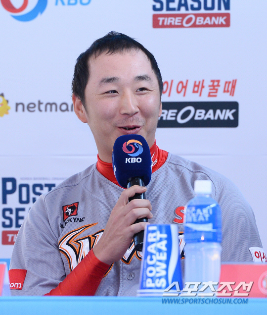 6일 목동구장에서 와일드카드 결정전 미디에데이가 열렸다. 7일부터 넥센과 SK는 2015 KBO 포스트시즌(PS) 와일드카드 결정전을 펼친다. 미디어데이에 참석한 SK 정우람이 질문에 답하고 있다. 목동=송정헌 기자 songs@sportschosun.com/2015.10.06 |