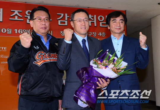 16일 오전 부산 사직야구장에서 롯데 조원우 감독의 취임식이 열렸다. 취임식에서 이윤원 단장(왼쪽부터), 조원우 감독, 이창원 대표이사가 포즈를 취하고 있다. 부산=김경민 기자 kyungmin@sportschosun.com / 2015.10.16.